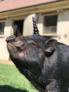 Kevin Bacon (aka glitter pig) was our beloved barn mascot for nearly a decade. He will be fondly remembered for his snorts and grunts, his patience with children, and his tolerance of unicorn horns. He is greatly missed.